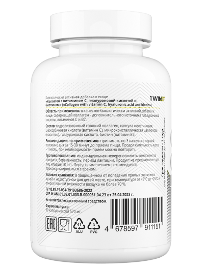 1WIN Коллаген с витамином С, гиалуроновой кислотой и биотином / Сollagen with vitamin C, hyaluronic acid and biotin капсулы массой 570 мг 90 шт