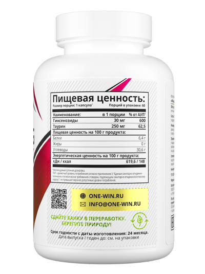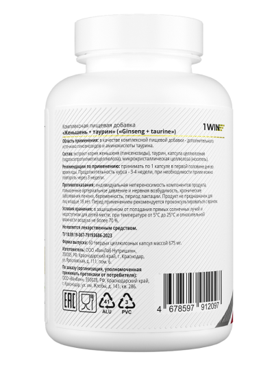 1WIN Женьшень + таурин / Ginseng + taurine капсулы массой 675 мг 60 шт