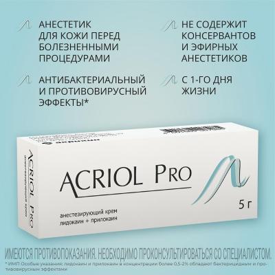 Акриол Про — комбінований препарат, до складу якого входять місцеві анестетики амідного типу — лідакаїн та прилокаїн. Ці речовини забезпечують місцеву анестезію шкіри за рахунок проникнення у шари епідермісу та дерми. Ступінь знеболення залежить від дози препарату та тривалості нанесення.