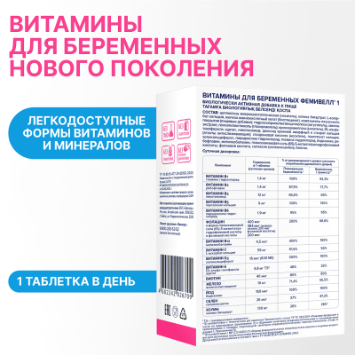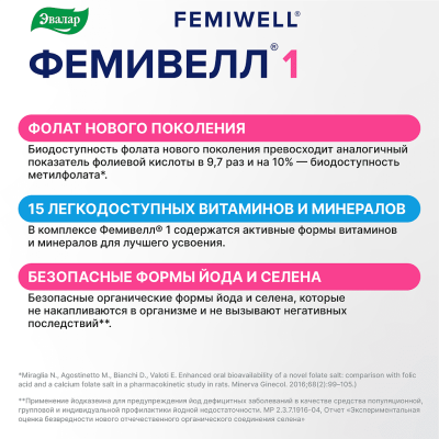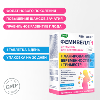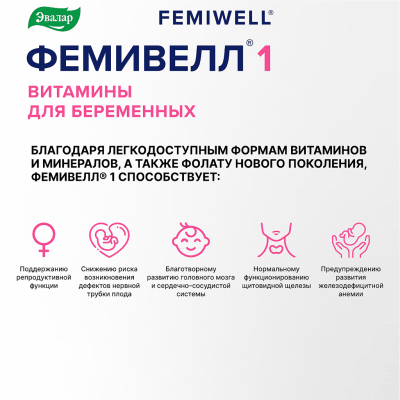 Вітамінний комплекс для вагітних Фемівелл®1 створений для жінок, що планують вагітність або перебувають у першому триместрі вагітності. Комплекс містить 15 активних вітамінів і мінералів у формі, що легко засвоюється, а також активну форму фолатів нового покоління — глюкозамінову сіль (6S)-5-метилтетрагідрофолиевой кислоти, що має найвищу біодоступність для організму.