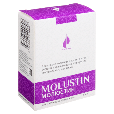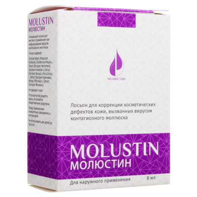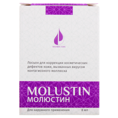 МОЛЮСТИН — косметичний засіб для зовнішнього застосування, який застосовується для ефективної та безболісної корекції дефектів шкіри, викликаних контагіозним молюском (Molluscum contagiosum). Препарат сприяє руйнуванню уражених клітин, активізує імунну відповідь організму і сприяє швидкому загоєнню пошкоджених ділянок шкіри без утворення рубців та шрамів.