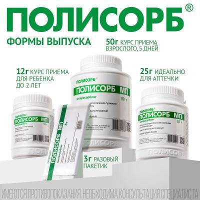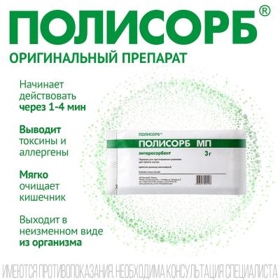 Полісорб МП – це неорганічний, неселективний, полифункціональний ентеросорбент, створений на основі високодисперсного кремнезему з розміром частинок до 0,09 мм. Сорбційна здатність препарату при внутрішньому застосуванні становить до 300 м²/г. Завдяки своїм унікальним властивостям він активно зв'язує і виводить з організму токсини, бактерії, бактеріальні токсини, алергени, лікарські препарати, солі важких металів, радіонукліди, алкоголь та інші шкідливі речовини.