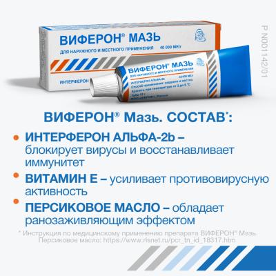 Віферон®, мазь – це лікарський препарат з протизапальними, імуномодулюючими та противірусними властивостями, який застосовується для місцевої терапії інфекційних уражень шкіри та слизових оболонок. Препарат містить у своєму складі рекомбінантний інтерферон альфа-2b, що сприяє підвищенню місцевого імунітету та боротьбі з вірусами.